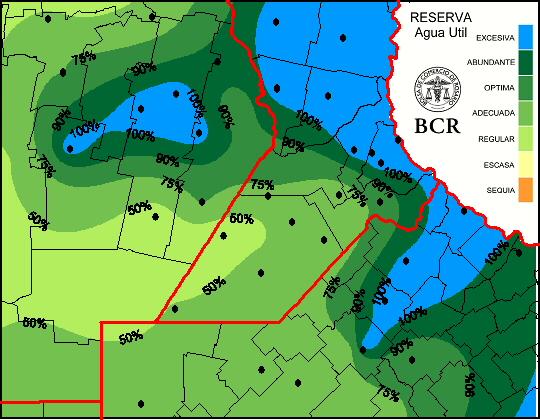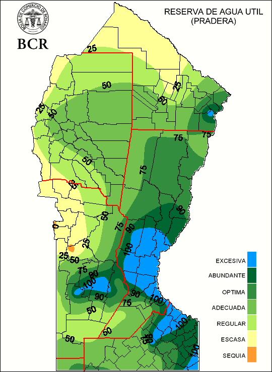 Las características de humedad del suelo han cambiado de manera drástica, con características que pasaron de sequía a excesos. Especialmente sobre la provincia de Santa Fe o sectores de Córdoba, donde la semana pasada se presentaban condiciones de sequía o humedad escasa y ahora, luego de las muy intensas lluvias del fin de semana, pasaron a presentar excesos hídricos. Solo el sudeste de Córdoba y el sudoeste de Santa Fe mantienen características de humedad edáfica que varían entre regulares y adecuadas, mientras que el resto de la zona GEA presenta condiciones hídricas abundantes a excesivas. Más allá de considerar que esto fue un alivio para la condición de los cultivos implantados el efecto fue contrario, ya que el intenso caudal de agua en tan corto periodo de tiempo complicó tanto las tareas de cosecha como el estado de los cuadros recién implantados.