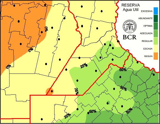 El desarrollo de estas tormentas de variada intensidad ya han dejado importantes acumulados en el centro y sudeste bonaerense. El desplazamiento continúa hacia el centro del país. Lo que está pasando es muy importante, porque constituye un cambio en la dinámica atmosférica instalada durante los últimos treinta días. Tambien es muy oportuno para compensar el aumento de la demanda de humedad que ya era muy significativa en la franja mediterránea, y más aún en el oeste de Chaco, Córdoba, norte de Santa Fe y Santiago del Estero, como muestra el mapa de reservas de humedad del suelo.