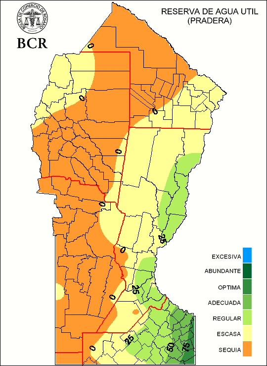 Con este panorama, y en función de las precipitaciones recibidas, las reservas de agua en el suelo mejoraron en la zona este del área GEA, abarcando el este de Santa Fe y centro/este de Buenos Aires, donde la humedad edáfica es entre regular a óptima. Las condiciones decrecen hacia el oeste manteniendo niveles de escasez, con un aumento del área en sequía en Córdoba.
