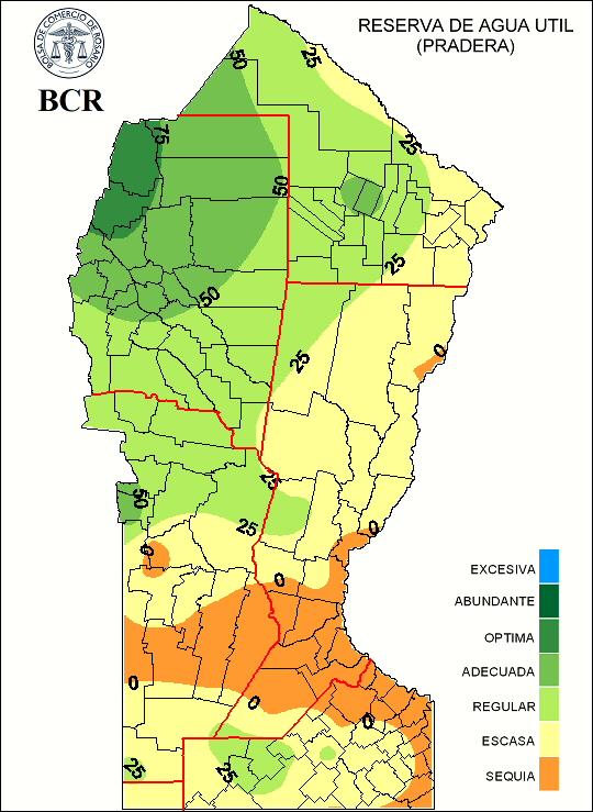 Con este panorama las áreas con reservas escasas cubren gran parte de la zona GEA. En el sector sur persisten núcleos de condiciones regulares y las zonas de sequía aumentaron, principalmente en el centro y norte.