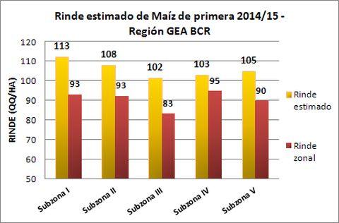 El maíz de primera pasó glorioso su periodo más crítico y ahora cuenta con suficiente humedad en el perfil para terminar de llenar sus granos. El 51% está en grano lechoso y un 34% en grano pastoso. Como en pocas campañas, el cereal temprano recibe excelentes y muy buenas calificaciones en el 87% de los cuadros. Tal como puede apreciarse en el gráfico adjunto, las estimaciones de rindes son prometedoras y aspiran superar en un 17% el rinde medio de la región (93 qq/ha).