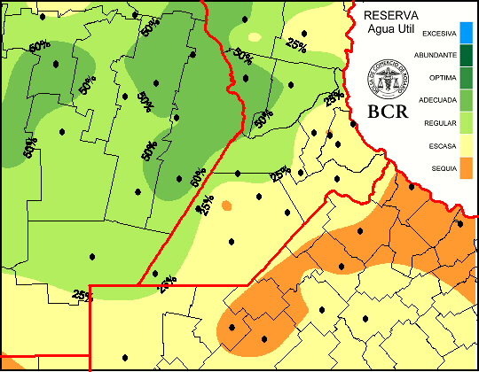 De esta manera, las reservas de agua de los suelos al primer metro de profundidad (considerando el consumo de una pradera permanente) actualmente van de escasas a sequía en la mitad de la región núcleo, y si se suma el área con contenido de agua regular, el guarismo asciende al 80%, siendo el noreste bonaerense el sector más seco.