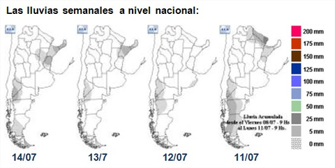 Durante esta semana las precipitaciones fueron prácticamente nulas en toda la región. Pero siguen manteniéndose condiciones de alta humedad y se destacan las temperaturas que estuvieron en constante ascenso siendo significativamente superiores a las de la semana anterior, inclusive más elevadas que las normales para el mes de julio.