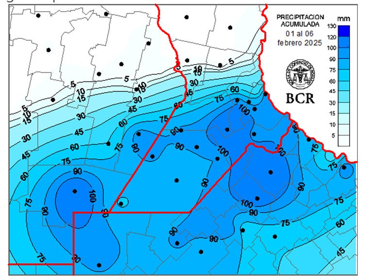 12 de las 36 estaciones ubicadas en el norte de la región, sobre todo el NO, recibieron menos de 10 mm o incluso no tuvieron registros. Pero en el resto, los acumulados del evento dejaron entre 60 y 120 mm. Hace una semana, técnicos de Pergamino advertían: “La sequía es total, y esperamos una pérdida de cosecha similar a la de la campaña 2022/23. Si lloviera ahora, todavía se podrían rescatar rendimientos aceptables”. Finalmente, cayeron 116 mm y el NE bonaerense, el epicentro de la sequía, recibió acumulados que van de 90 a 120 mm. Elorriaga explica: “un centro de alta presión, ubicado al sur de la costa de Buenos Aires, potenció el ingreso de humedad sobre el norte bonaerense y la franja sur de la zona núcleo”. De todos modos, llegan advertencias desde la zona de Marcos Juárez: “hay pérdidas de rinde irreversibles en soja en la mayoría de los lotes. En soja de primera, la merma estimada es del 25 % y un 10 % podría rendir menos de 20 qq/ha si no llegan lluvias pronto”.