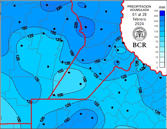 En el mes de febrero, la región núcleo acumuló un promedio de 147 mm, alcanzando la media de lluvias del mes de los últimos 30 años. Los promedios para la región oscilan entre 100 y 150 mm (de oeste a este). El centro sur de Santa Fe y el este de Córdoba fueron las zonas con los mayores milimetrajes, superando 150 mm. Según datos de la Red de estaciones Meteorológicas de la BCR: Montes de Oca registró 266 mm; Pozo del Molle, 241 mm y Carlos Pellegrini 243 mm. Noetinger marcó 192 mm y Colonia Almada, 191 mm. El norte bonaerense logró superar los 100 mm. Los mayores acumulados se registraron en Lincoln con 172 mm; General Pinto con 161 mm y Baradero, 150 mm. Solo un sector del sur de Santa Fe quedó por debajo de los 100 mm: Rufino acumuló 98 mm y Maria Teresa, 90 mm.