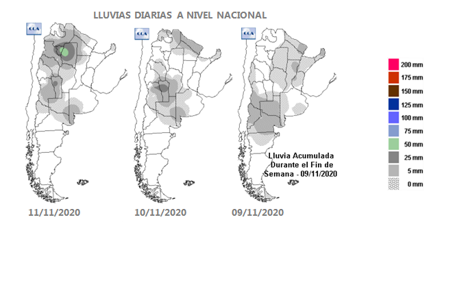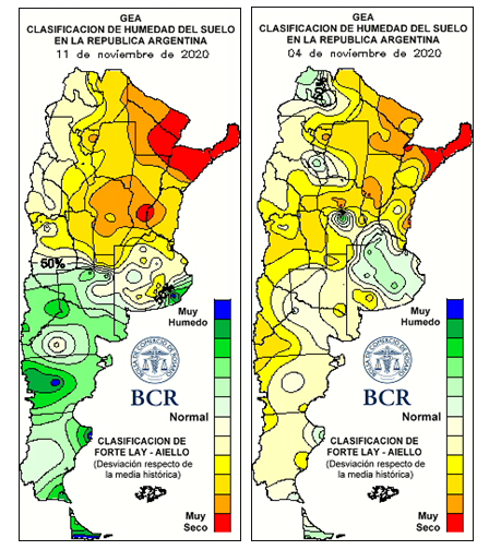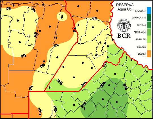 La escasa humedad de los primeros centímetros de suelo aceleraron las labores de siembra hasta cubrir un 75% del área de soja de la región núcleo. En el centro sur de Santa Fe y este de Córdoba, algunas sembradoras se frenaron esperando una nueva recarga hídrica. Estas zonas no sólo requieren una lluvia para continuar con la labor sino también unos 100 mm en promedio para recomponer el déficit que se arrastra desde el otoño. “La falta del 50% de las lluvias promedios anuales se siente más en estos meses de alta demanda atmosférica", refuerzan en Carlos Pellegrini. En Bigand se avanzó la siembra hasta el 85% del área planeada y se detuvo por la falta de humedad en superficie. En la región la situación hídrica es muy heterogénea, con sectores que presentan muy buenas condiciones de humedad, como el norte bonaerense y otros con una sequía preocupante. En la zona Colón la siembra de soja temprana finalizó sin inconvenientes. “Las reservas de agua alcanzan para dos semanas más, luego se requeriría una recarga hídrica”, indican los ingenieros. Si bien hay chances de lluvias para este viernes, la probabilidad de ocurrencia se mantiene baja.