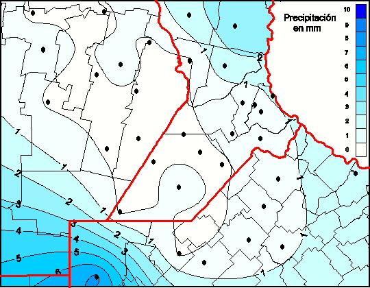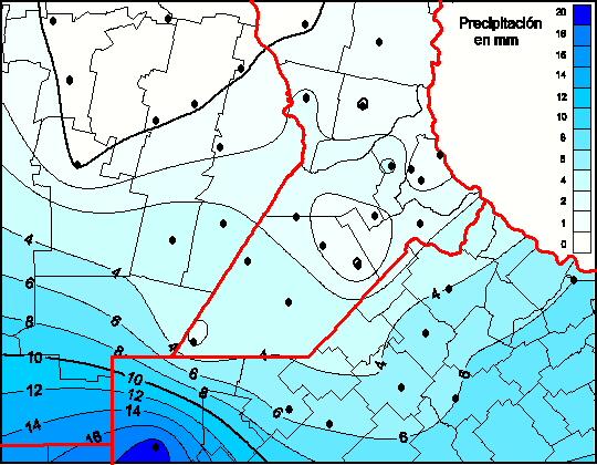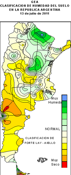 Durante la semana, las precipitaciones fueron muy heterogéneas en la zona GEA, con un significativo gradiente norte-sur. Hubo acumulados prácticamente nulos en la zona norte de la región, y registros de entre 20 y 30 mm en la franja sur. El valor más importante fue observado en la localidad de Villegas, en el noroeste de la provincia de Buenos Aires, con un total semanal de 28,4 mm. Respecto a las marcas térmicas, las temperaturas mínimas fueron significativamente inferiores a las de la semana previa, observándose importantes heladas en toda la región. El valor más extremo fue el medido por la estación automática ubicada en la localidad de Canals, en el sudeste de Córdoba, con 6,1° C bajo cero. Dadas las características de la semana, el contenido de agua en el suelo presenta un panorama similar al periodo anterior, aunque con un leve detrimento. Sobre la provincia de Córdoba, las reservas son regulares o escasas, con algunas zonas puntuales que presentan características de sequía. El panorama sobre Santa Fe y Norte de Buenos Aires es diferente, ya que las reservas se mantienen entre regulares y óptimas, sobre todo al avanzar hacia el este.