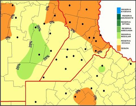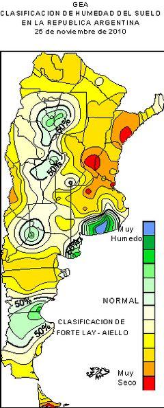 La importante evapotranspiración sufrida debido a los altos valores de temperatura y las escasas lluvias registradas en la última semana, provocaron una significativa pérdida de humedad del suelo, el cual continúa deteriorándose semana a semana. Prácticamente el 100% del territorio GEA presenta condiciones hídricas escasas o sequía. Los efectos del evento "La Niña" están presentándose enérgicamente con los impactos previstos en precipitaciones por debajo de lo normal y temperaturas por encima.