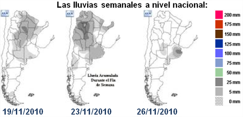 Semana de escasas precipitaciones en toda la región nucleo. Se registraron algunas lluvias débiles y en forma aislada, en especial sobre el este de la provincia de Córdoba, donde se midieron 46,8mm en la localidad de Monte Buey. El resto de la región mantuvo lluvias entre 5 y 20mm, incluso con algunas zonas en las cuales no se registraron precipitaciones (norte de la provincia de Buenos Aires). Los valores de temperatura fueron muy altos, superando, en prácticamente toda la región, los 33° C con picos por encima de los 37° C. El valor más extremo se registró en María Teresa, al sur de la provincia de Santa Fe, donde la marca térmica llegó a los 38,4° C.