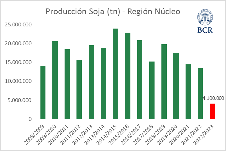 Desde el 2008/09, la peor cosecha de soja era la del 2021/22 con 13,5 Mt. Pero la 2022/23 dejará tan solo 4,1 Mt, o sea el 33% de lo que se produjo el año pasado. La soja, tal como pasó con el trigo 2022/23, está en una situación de total desastre productivo en la región núcleo.