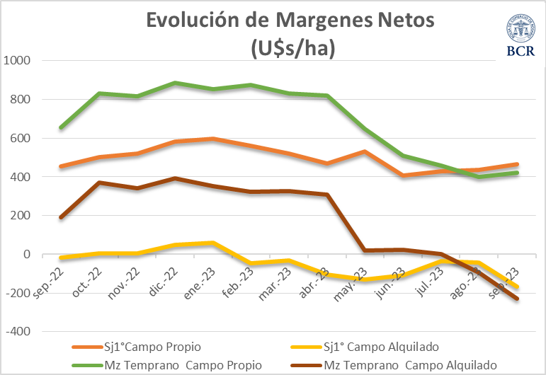 Cuando se comparan los márgenes actuales contra septiembre del 2022, todos los cultivos experimentaron una caída con excepción de la soja de primera y segunda en campo propio. Hacer soja de primera en campo propio representa una ganancia extra de 12 u$s/ha respecto de un año atrás y la de segunda apenas, 2 u$s/ha.