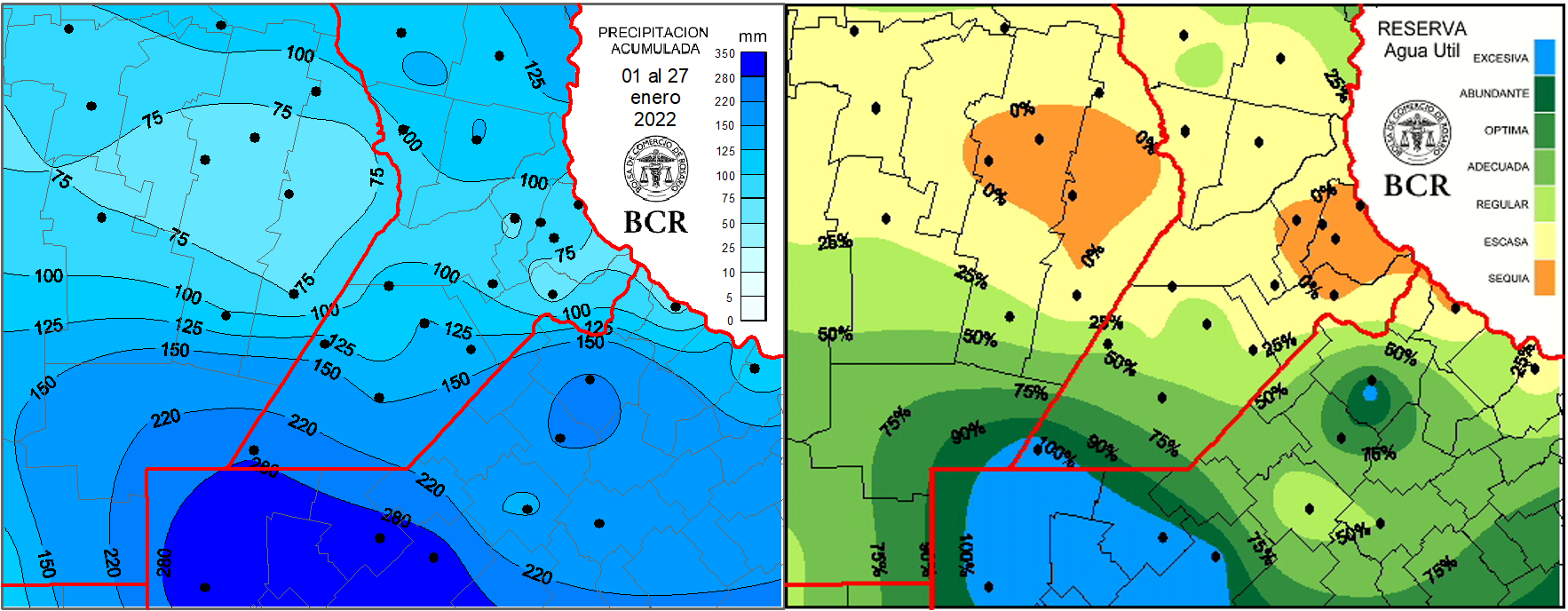 Desde el punto de vista climático la respuesta es clara: sí, la situación se resolvió con el cambio atmosférico de la segunda quincena de enero. Pero desde el punto de vista de los cultivos no, ya que el 50% de la región núcleo sigue con reservas escasas y sequía teniendo en cuenta la demanda de una pradera permanente. Pero la demanda de la soja de primera es mucho más importante: está en estado reproductivo, de hecho el 42% ya se encuentra en plena fructificación que es cuando empieza el período crítico y la mayor demanda hídrica. Los acumulados de enero muestran que todas las zonas que recibieron menos de 100 mm tienen problemas para afrontar lo que sigue si las próximas dos semanas de febrero no compensan la faltante de milímetros. Hay que tener en cuenta que la media de enero es de 120 mm y muchas zonas terminaron la primera quincena con los suelos vacíos, lo que sumado a los valores extremos de temperaturas produjo un deterioro en soja y maíz que muchos agrónomos califican como inédito. En esta semana también hay excesos sobre el noroeste de Buenos Aires, que recibió lluvias excepcionales de casi 300 mm. Sin embargo, en General Pinto explican que a pesar de haber recibido 250 mm en tan pocos días, la falta de agua era tan importante en los perfiles de los suelos que los excesos de agua se fueron muy rápido y no hubo pérdidas por anegamientos en los lotes. La cantidad de milímetros que falta en el área del centro y norte de GEA, zona que sigue arrastrando los efectos de la sequía, van de 100 a 140.
