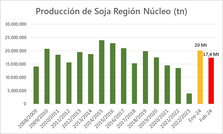 Un mes atrás, se proyectaban 20,2 Mt y rinde record de 41 qq/ha en la región núcleo. A pesar de las lluvias, la intensa ola de calor dejó una cosecha de 17,4 Mt para la zona.