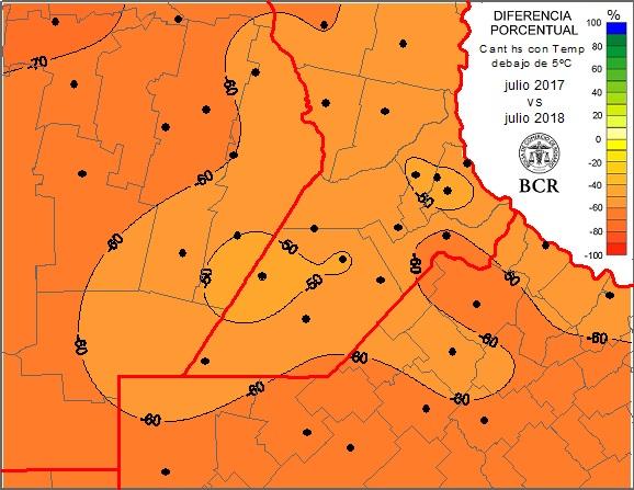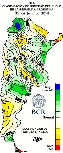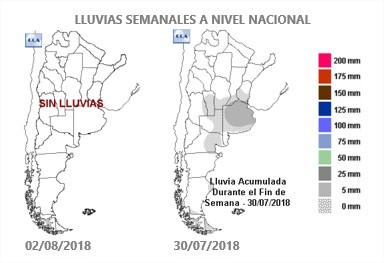 En la última semana, las lluvias que se desarrollaron fueron débiles, pero muy recurrentes. Hubo sectores que acumularon más de 15 mm. Con nuevas provisiones de humedad el trigo sigue muy bueno en el 75% del área, tras un julio que se va con las lluvias que las estadísticas le mandan: más de 40 mm hacia el este, que disminuyen siguiendo el típico gradiente invernal hasta los 5 a 10 mm en el oeste. El año pasado estos valores eran casi el doble. El ambiente húmedo y las altas temperaturas dominaban la región apurando las etapas del cultivo. En cambio este año, el crecimiento aéreo es muy lento. Sólo un 30% del área triguera ingresa esta semana a la etapa de macollaje, completando el 83% de los cuadros que se encuentra transitando este estadio. Un 13% está desarrollando hojas y un 3%, más atrasado todavía, se encuentra emergiendo.