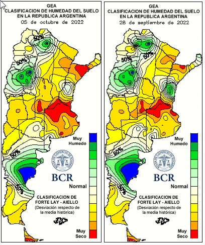 De las 1,2 M de ha sembradas con trigo que siguen hacia cosecha, un 34% está en mala condición, 46% regular, 18% bueno y 2% muy bueno. Desde Bigand advierten la situación del cultivo que es muy mala. “Seguimos sin lluvias, y se agrava todo. Ya hay un 20% de los lotes perdidos. Irán a soja de primera, si llueve”. Desde San Gregorio la situación es igual de crítica: 35% de los trigos perdidos. En Facundo Quiroga ya se perdió el 20% de la superficie. Del resto, el 90% está de regular a malo (70% malo, 20% regular). En el norte de región núcleo la situación mejora gracias a algunos milímetros extras que recibieron en El Trébol. Pero incluso muy cerca, en Carlos Pellegrini advierten que tiene que llover más de 30 mm dentro del mes de octubre. “El rinde potencial promedio que estimamos en 20 qq/ha va a quedar grande sino: “es el momento de mayor necesidad de agua, están definiendo la cantidad de granos a formar pero también el peso potencial”.