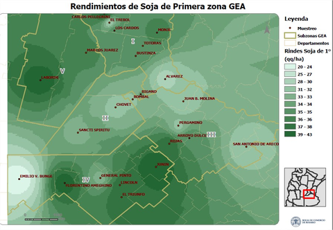 Hasta el momento se recolectó un 53% de lo implantado en soja de primera. Los rendimientos están en un amplio rango de 27,1 a 43,9 qq/ha, marcando una media general de 34,3 quintales. En el mapa de rindes se aprecia que en el noreste bonaerense y en buena parte de la franja sur de Santa Fe los fuertes excesos bajaron las expectativas de los rindes a cosecha.