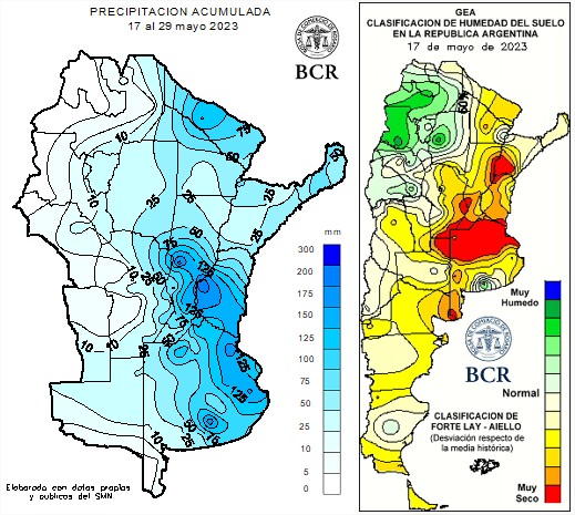 Hasta el 17 de mayo, los perfiles de los suelos en el centro de la región pampeana estaban en las condiciones más secas de los últimos 30 años. Las peores condiciones se observaban en territorio bonaerense. Las lluvias de la última semana dejaron fuera de juego a Córdoba, La Pampa y San Luis ya que se recostaron sobre el este. La región pampeana quedó partida por la mitad. La imagen de las lluvias desde el 17 de mayo es elocuente: la franja este recibió entre 50 y 175 mm.