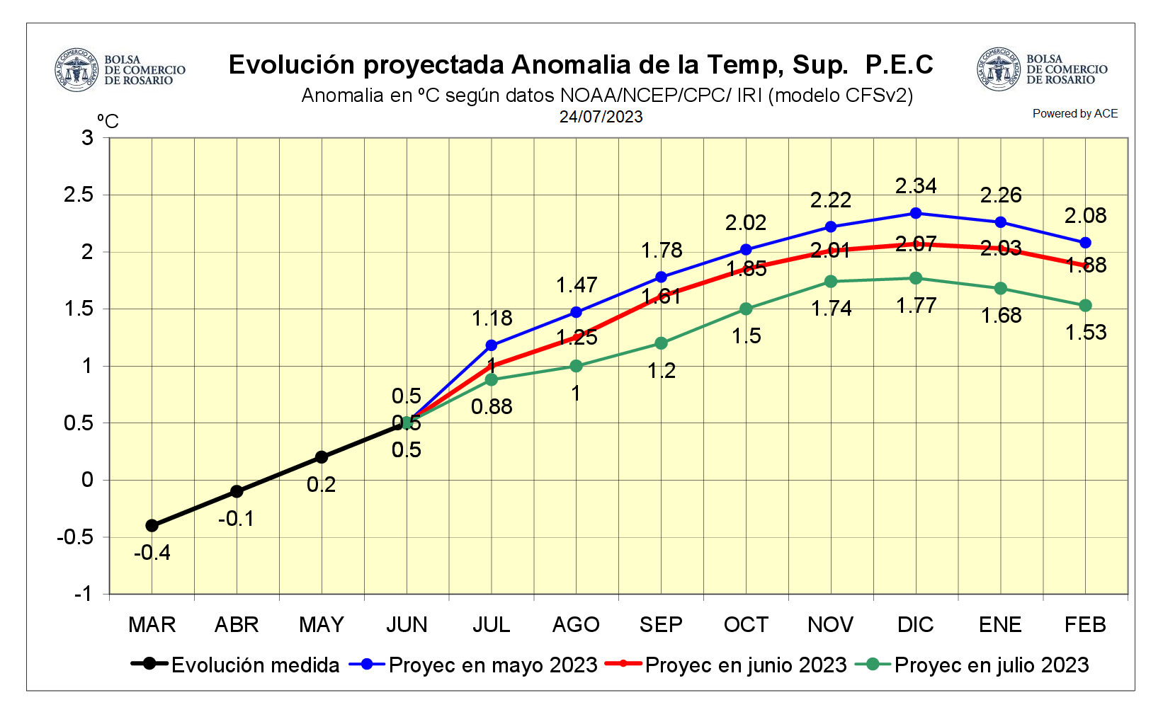 Las últimas actualizaciones de la NOAA muestran valores distintos a los que se proyectaban un mes atrás y un cambio de intensidad en el fenómeno del Niño: el Niño fuerte pasaría ser un Niño moderado. ¿Qué es lo que está pasando? “El océano no se termina de acoplarse con la atmósfera y no se potencia la actividad de los vientos que son responsables del transporte de humedad”, explica el consultor Elorriaga. El comportamiento de los vientos es otra de las variables que define la intensidad del fenómeno, además de las anomalías de las temperaturas que se miden en el Pacífico Ecuatorial. Para que no queden dudas, un nuevo gráfico compara esta situación y su evolución y lo contrasta con lo que se estaba esperando hace uno y dos meses atrás.