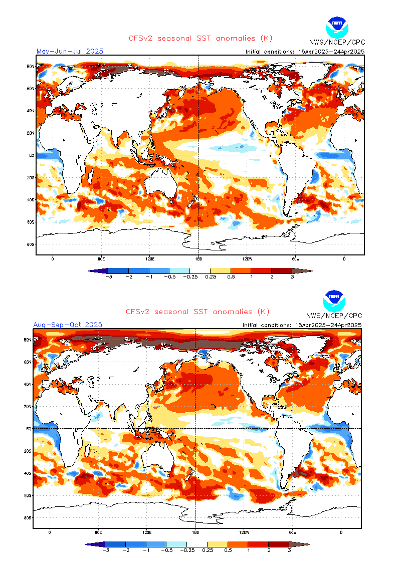 —Las imágenes de anomalías de temperaturas superficiales (SST) de la NOAA para el Atlántico sur muestran que desde septiembre 2024 a abril 2025 las anomalías positivas fueron una constante. En los últimos 8 meses, y en forma consecutiva, hubo temperaturas oceánicas por encima de los valores medios.