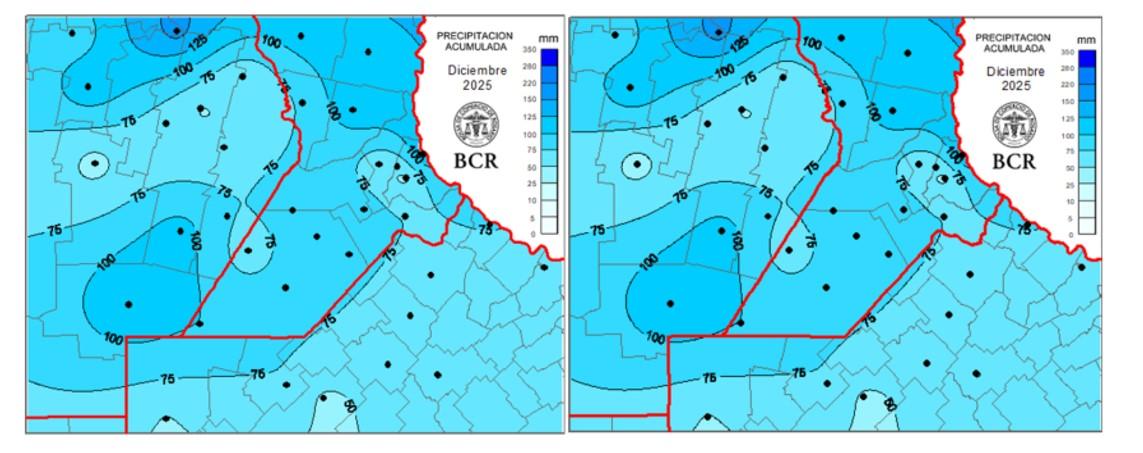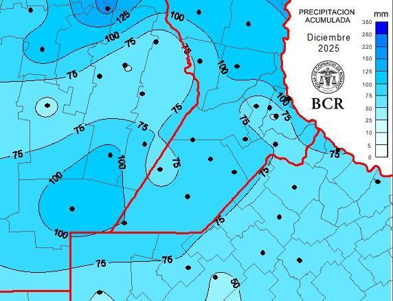 Luego de cinco meses consecutivos con precipitaciones por encima de la media, diciembre quebró la racha y cerró con un acumulado promedio de 80 mm en la región núcleo, por debajo de los 110 mm que marca el valor histórico para el mes. La irregularidad de las lluvias dejó amplios sectores con registros deficitarios, como en el norte bonaerense, donde Lincoln acumuló 47 mm; Baradero, 51 mm y Pergamino, 54 mm en todo el mes. Un comportamiento similar se observó en una parte del sudeste cordobés, con solo 40 mm en Bengolea y 52 mm en Noetinger. También hubo áreas del sudeste de Córdoba y del centro-sur santafesino que lograron superar la media, destacándose Pozo del Molle con 161 mm, Hernando con 125 mm, Laboulaye y Rosario con 122 mm, Classon con 118 mm e Irigoyen con 117 mm. Este patrón errático de precipitaciones es típico de los meses de verano, cuando predominan las lluvias convectivas, caracterizadas por su alta variabilidad espacial, gran intensidad, corta duración y marcada localización.