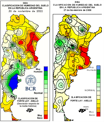 En aquel entonces, el área más afectada era el este, en especial el sureste: Buenos Aires, Entre Ríos y el SE santafesino. A esta altura del año (2022), gran parte del norte y este de la región pampeana muestran los niveles más bajos de agua en el suelo considerando las estadísticas de los últimos 30 años. La situación es más grave que en el 2008 en Santa Fe, Entre Ríos y norte de Córdoba. Esto se refleja en la comparación del mapa de anomalía de las reservas hídricas al 27 de noviembre de 2008 con la actual (30 de noviembre). Lamentablemente, sin los eventos de lluvias que se dieron en diciembre del 2008, la tendencia es que la situación se agrave al 20 de diciembre de este año.