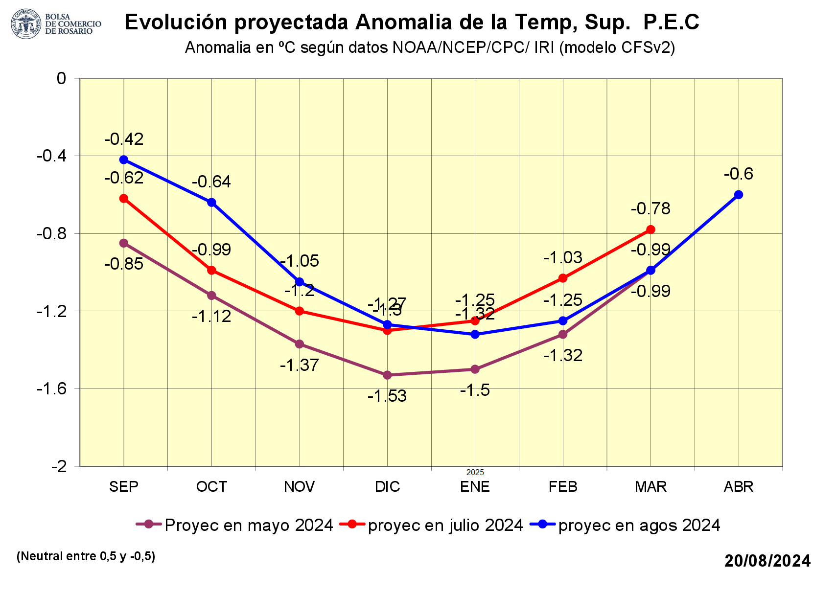 Los datos de las actualizaciones más recientes por los organismos internacionales muestran un significativo corrimiento en el tiempo de los valores más bajos de enfriamiento en el Pacífico. Esto cambiaría el impacto de “La Niña” sobre la gruesa 2024/25: se plantea un mejor escenario para el maíz temprano y más riesgo para la soja de primera en Argentina.