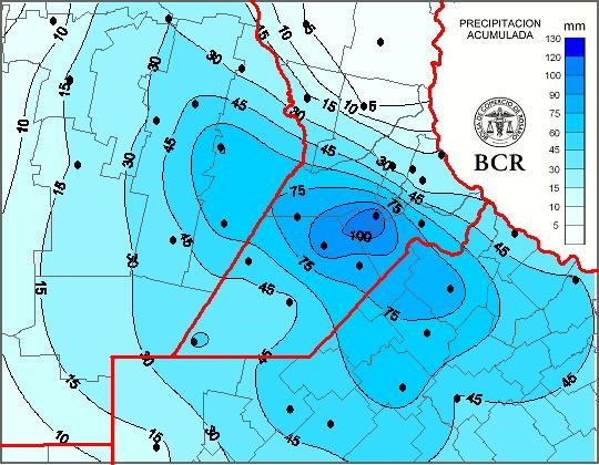 Las lluvias que anticipamos siete días atrás se cumplieron y sorprendieron sus montos: se esperaban 10 a 40 mm y la región recibió entre 30 y 110 mm. Bigand registró el máximo, 110 mm, registro muy festejado en el área ya que había sido una de las localidades más castigadas por la sequía en los últimos 3 años. Le sigue Chovet con 100 mm y luego Pergamino y Godeken con 84 y 82 mm. Siguen en la lista una localidad del sur santafesino y otra del sudeste cordobés: Labordeboy y Monte Buey con 80 y 76 mm.