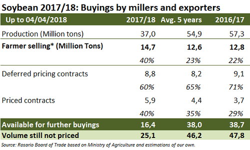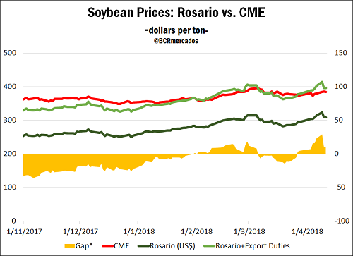 This does not mean that buyers are purchasing grain, but on the contrary, the origination of merchandise both in the local and international market is above the last campaigns. In addition to last week's purchase of soybeans from the US for a total of 240,000 t, as reported by the USDA, estimates of imports of soybeans from neighboring countries, mainly Paraguay, would far exceed initial expectations. Regarding the Argentine grains, according to information provided by the Minister of Agroindustry, to April 4, 40% of the estimated soybean production for the 2017/2018 season had already been purchased, practically twice the average of the last 5 campaigns. This ratio also doubles the 22% of the last season at the same height of the year. With a theoretical processing capacity of the oil industry of 66 million tons, it is clear that the grain provision for the manufacture of flour, oil, and other by-products with higher added value will be a difficulty to solve in the coming months.
