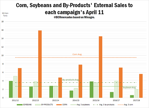 Faced with the productive uncertainty, the export market is very cautious in the sales statements, although it is believed that the latest changes in the registration regime (which allow export duties to be levied according to the effective date of shipment) could stimulate businesses. Today the external sales of both soybeans and corn are substantially below not only of those of the previous season, but also of the last 5 campaigns average, at the same point of the year. In fact, soybeans sworn external sales statements (DJVE by it's name in Spanish) were in April 11 about 611 thousand tons, which represents 45% of the previous season at the same height and only 25% of the average of the last 5 campaigns. In the case of the oilseed's by-products (meal and oil), 2 MT were sold, when last year's value doubled this figure. In the case of corn, the situation is less severe, with 5.6 MT, 79% of that of the previous season has been sold, and 56% of the last 5 campaigns average.