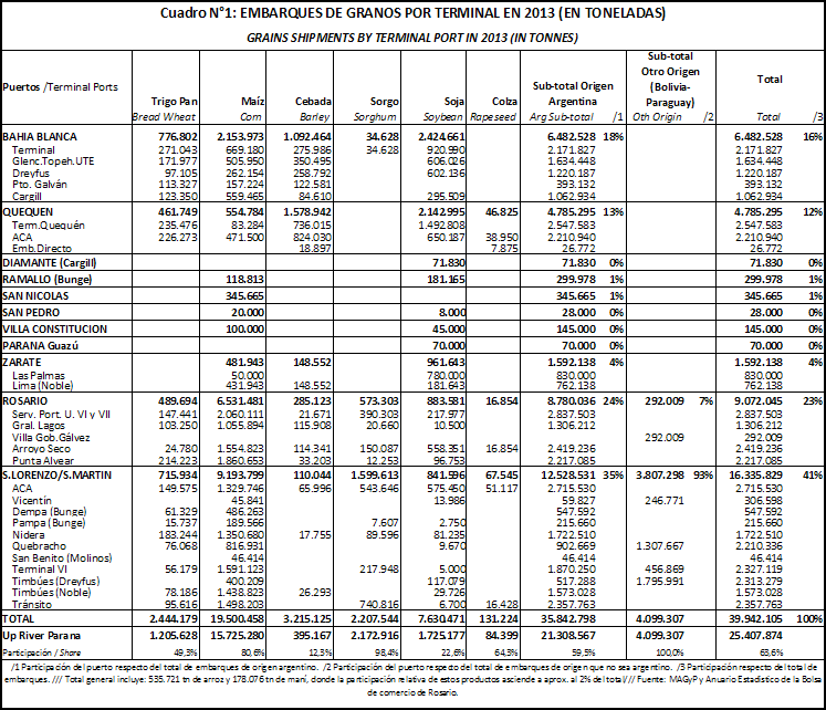 Los puertos del Gran Rosario (denominados en el presente trabajo Puertos “Up River Paraná”) remitieron al exterior -en el año 2013- un total 25.407.874 toneladas, lo cual representa el 63,6% del total de los granos despachados desde puertos argentinos. Recordemos que este total incluye los granos de origen argentino, paraguayo y boliviano junto con despachos de arroz y maní.Le sigue –en orden de importancia- las terminales portuarias de Bahía Blanca, quienes despacharon 6,4 millones de toneladas de granos, aproximadamente el 16% del total. En tercer lugar se ubicaron las terminales del Puerto de Quequén, quienes despacharon 4,7 millones de toneladas en el 2013, representando un 12% del total nacional. En cuarto lugar se posicionaron las de Zárate (Las Palmas y Lima), quienes embarcaron cerca de 1,6 millones de toneladas (4% del total).