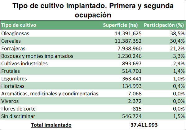 Los principales cultivos en área fueron las oleaginosas con 14.391.625 Mha (el 38,5% de la superficie total), con la superficie destinada a los cereales (para grano) en 11.387.352 Mha (30,4% del total), ambos al considerar la suma de la superficie con cultivos de primera y segunda ocupación, por lo que el mismo campo puede haberse utilizado para producir ambos u otros cultivos.