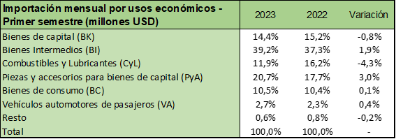 Comparando estos números con los del mismo período en el año anterior, se puede observar que la importación de Piezas y Accesorios para bienes de capital fue la que más aumentó, ganando 3 p.p. de participación, mientras que la importación de Combustibles y Lubricantes la que más cayó, con una caída de 4,3 p.p.