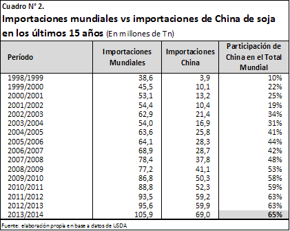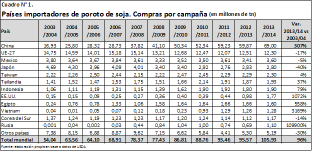 Se puede observar del cuadro mencionado que la comercialización de soja a nivel mundial ha estado creciendo de manera significativa, duplicándose en el período citado. En efecto, de 54 millones de toneladas despachadas en 2003/2004, en la actual campaña se estarían vendiendo cerca de 106 millones de toneladas (96% más), según previsiones del USDA. El principal responsable de este notable crecimiento es China, que pasó de adquirir casi 17 millones de toneladas hace 10 años, a comprar en el ciclo 2013/2014 cerca de 69 millones de toneladas, lo que implica que ha cuadruplicado sus compras de poroto en la última década, con el lógico efecto alcista sobre los precios internacionales del producto. Este crecimiento en las importaciones tuvo como correlato un incremento en la participación de China en el comercio mundial de poroto de soja, que pasó del 31,3% al 65% en el período analizado.En contraste, la Unión Europea presenta una evolución diametralmente opuesta a China, ya que ha ido reduciendo sus importaciones de poroto de soja en estos 10 años. El USDA prevé que en la campaña 2013/2014 las compras de la UE-28 serán de 12,3 millones de toneladas, lo que implica una caída del 17% en la última década. De participar con el 27% del total de las importaciones mundiales en 2003/2004, en la actual campaña Europa participaría con apenas el 11,6%.