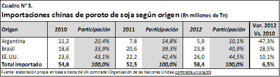 La importancia creciente de este país en el mercado internacional de soja se hace más evidente cuando extendemos el plazo de análisis a 15 años. En el cuadro N° 2 se observa que en la campaña 1998/1999 las importaciones mundiales de poroto de soja ascendían a 38,6 millones de Tn y China compraba apenas el 10% del total, cerca de 4 millones de toneladas. Pasar del 10% del mercado mundial al 65% en 3 lustros pone de manifiesto la jerarquía que ostenta este país asiático en el mercado internacional de la soja, y con ella, la dependencia que tienen los países sojeros del ritmo de compras chinas, especialmente, Estados Unidos, Brasil y –en menor medida- Argentina, los principales proveedores de la oleaginosa a nivel mundial.De hecho, según información de UN Cometrade, base de datos de las Naciones Unidas sobre comercio internacional, en el año 2012 China le compró a Estados Unidos el 45% del total de porotos de soja adquiridos del exterior, el 41% a Brasil y el 10% a Argentina. Lo anterior se puede visualizar en el Cuadro N° 3.