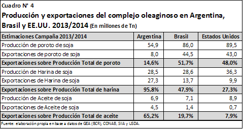 China necesita soja porque debe alimentar a una enorme población, pero necesita el grano porque posee un amplio complejo procesador que no dispone de suficiente materia prima. A priori, de los tres principales productores y exportadores de soja, nuestro país parecería ser el menos ligado a la evolución de la demanda china, debido a que el fuerte del complejo oleaginoso nacional son las exportaciones de productos con valor agregado, como ser biodiesel, aceite y harina de soja, y no las ventas al exterior de granos sin procesar. Esto puede visualizarse en el Cuadro N° 4, donde se detalla para los tres principales países exportadores de soja, Estados Unidos, Brasil y Argentina, el porcentaje de producción de poroto, harina y aceite que se vende al exterior. Como puede apreciarse, Argentina sólo exporta –como grano- el 14,6% del poroto de soja que produce, mientras que Brasil y Estados Unidos venden el 51,7% y 48% respectivamente. Esto llevaría a pensar -a priori- que estos dos últimos países poseen más dependencia de China que Argentina, porque para ellos es más relevante la comercialización de soja sin procesar.Empero, se debe tener en cuenta que si bien Argentina posee una menor participación en las importaciones chinas de poroto de soja (Cuadro N° 3), sí es importante para el país contar con las compras del gigante asiático en lo que respecta a aceite, ya que es uno de los principales clientes de este producto. Asimismo, al tener un mercado de soja tan volcado a la exportación, lo que suceda con China impacta directa e indirectamente sobre la actividad agrícola nacional.