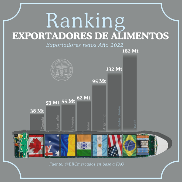 En términos de valor, en el 2022 Argentina se posicionó en segundo lugar en el ranking de exportadores netos de alimentos. Con un total de US$ 45.787 millones de exportaciones netas, el país quedó sólo por detrás del vecino Brasil, que alcanzó US$ 123.130 millones.
