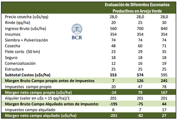 Con un rendimiento de 30 qq/ha, la arveja verde genera un margen neto de 167 USD/ha en campo propio y 27 USD/ha en arrendado. Si la productividad cae a 25 qq/ha, el margen se reduce a 79 USD/ha en campo propio y se vuelve negativo en campo alquilado, alcanzando –82 USD/ha. Con rindes de 20 qq/ha, las pérdidas se registran en ambos esquemas de tenencia, ya que la productividad se encuentra por debajo del rinde de indiferencia: 22 qq/ha en campo propio y 28 qq/ha con arrendamiento, considerando impuestos.