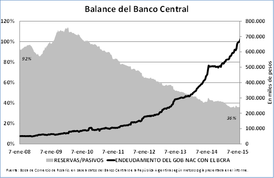 Las reservas internacionales, conforme la información contable presentada en el Balance del Banco Central, ascienden entonces a un 35,8% de los pasivos monetarios, en tanto que las reservas internacionales netas cubren un 17,5% de los mismos.