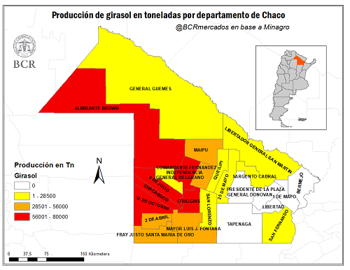 Estos tres departamentos junto a Chacabuco y O’Higgins se reparten más de la mitad de la producción de girasol de la provincia. Los cinco produjeron volúmenes similares que rondan entre las 72,5 y 80 mil toneladas.