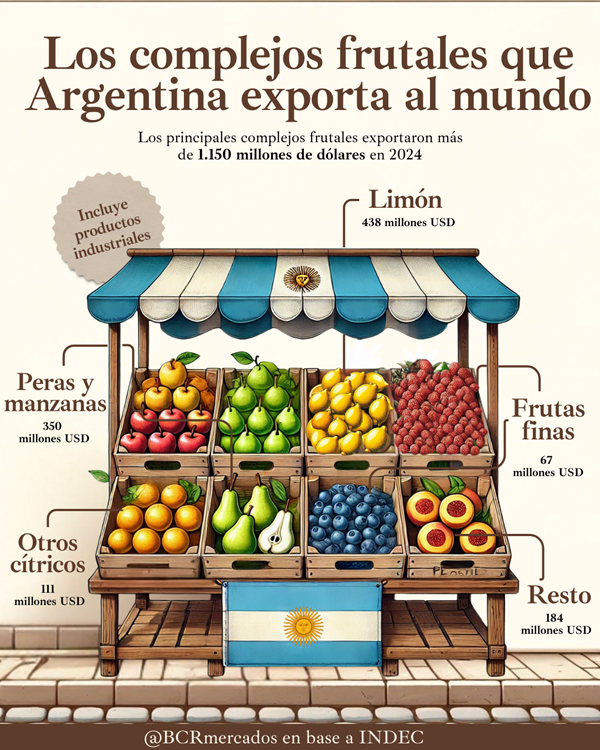 Sin embargo, dentro de estos frutales el complejo de mayor relevancia exportadora es el Limón, que realizó envíos al exterior por más de US$ 420 millones el año pasado. De esta manera, creció un 7% respecto al 2023, exportando más aceites esenciales de limón y menos limones, con su epicentro productivo en el clúster de nivel mundial ubicado en la provincia de Tucumán. El otro gran complejo generador de dólares para las frutas es el complejo Peras y Manzanas, compuesto en un 75% por peras y concentrado fundamentalmente en Río Negro. Este complejo marcó un crecimiento del 19% respecto al 2023. Finalmente, en el complejo Resto Frutícola se destacaron las ciruelas, los duraznos y las nueces, registrando un crecimiento del 37%.