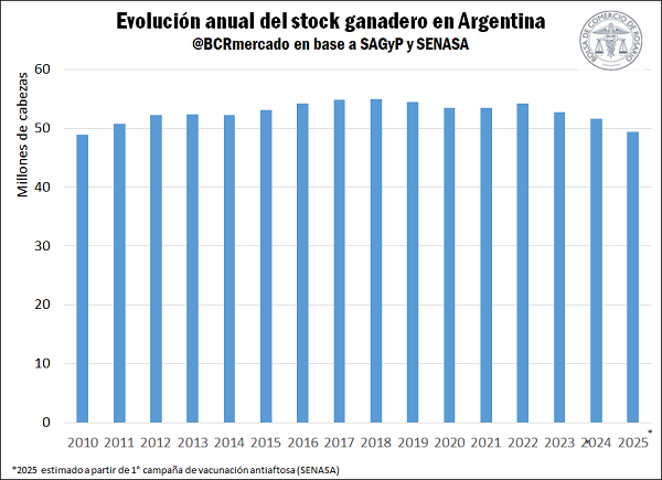 Como explicaba Rosgan en su informe de hace dos semanas, la mejora de la productividad es una condición necesaria para avanzar en la reconstrucción del stock ganadero. En dicho informe se detallaron las dificultades que los cambios normativos recientes podrían generar en la profundización de este sendero de expansión productiva. Cabe recordar que, de acuerdo con los datos del SENASA de la primera campaña de vacunación contra la aftosa, el rodeo se encontraría en torno a los 49,4 millones de cabezas. Si se contrasta esta información con los datos de existencias anuales de SAGyP, se observa que éste es el menor registro desde fines de 2010, cuando se contabilizaban 48,8 millones de bovinos. Debe tenerse en cuenta que ambas fuentes no son estrictamente comparables —la cifra de la campaña de vacunación puede ser inferior al stock total—, aunque la comparación sirve como una aproximación útil para dimensionar la evolución del rodeo.