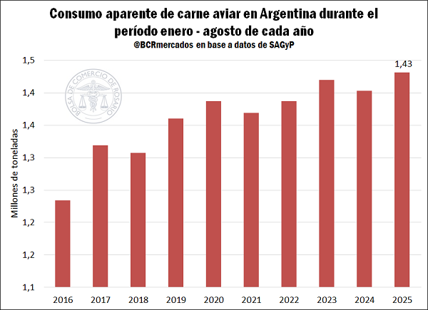 Por otra parte, la producción también se mantiene en torno a los niveles más elevados de la serie. Entre enero y agosto, se produjeron en Argentina 1,5 millones de toneladas de carne aviar, esto es un 0,5% por encima del año previo y un 0,3% superior al promedio de los últimos cinco años. El nivel de producción es prácticamente idéntico al de 2022, que fue el récord histórico.