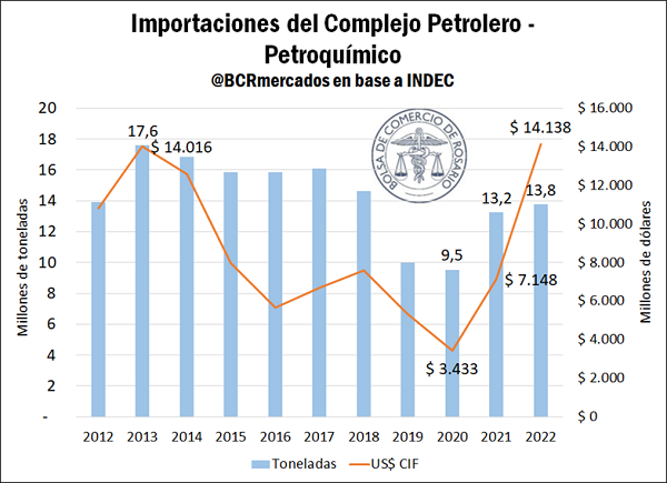 Rusia y Ucrania son importantes jugadores en los mercados internacionales de petróleo y gas. Argentina aún persiste como importador neto de energía para su abastecimiento interno. El estallido del conflicto disparó a nivel internacional el conjunto de los precios de la energía, en un marco de fuerte incertidumbre de producción y abastecimiento global. En un contexto de restricción de divisas, las importaciones del complejo Petrolero-Petroquímico pasaron de US$ 7.147 millones en 2021 a US$ 14.138 millones en 2022, prácticamente una suba del 100%, cuando las cantidades importadas crecieron menos de un 4%. Los principales renglones importadores del complejo son el gasoil (US$ 4.626 millones en 2022), el gas natural licuado o GNL (US$ 2.566 millones) y el gas natural en estado gaseoso, importado a través de gasoductos (US$ 1.692 millones).