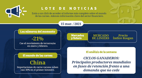 Ahora bien, por el lado de la demanda, tenemos a China que, pese a la recuperación anunciada en su stock porcino y la aparente estabilización de su balance interno, mantiene una tendencia de compras creciente en los tres tipos de carne. En el caso de la carne vacuna, durante los primeros dos meses del año importó 1,6 millones de toneladas, un 28% más respecto de lo importado un año atrás. En efecto, en las últimas semanas ha estado mejorando los precios pagados por la carne vacuna importada, señal que varios operadores comienzan a mirar con cautela.