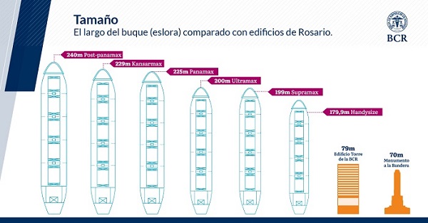 Por otro lado, si comparamos dicho buque con los otros tipos que ingresan a la región podemos ver que su eslora (metros de largo horizontal) queda bastante por debajo de los 225 m de un Panamax, buque de diseño de la Vía Navegable Troncal, o de los 240 m de eslora de un Post-Panamax, buque de carga a granel de mayor eslora que ingresó este año a las terminales de la región. Más aún, estas esloras son cerca de tres veces la altura del Monumento a la Bandera o del Edificio Torre de la Bolsa de Comercio de Rosario, ubicado en la calle Paraguay 777 de la ciudad de Rosario.