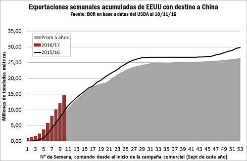 El gigante asiático es el responsable del 76% de las compras totales de esta campaña comercial con un acumulado de 14,5 millones de toneladas. Particularmente esta semana adquirió 2,3 millones de toneladas