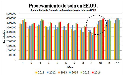 No solo la demanda para exportación se ha mantenido firme, también la proveniente de las plantas de procesamiento domésticas del poroto de soja. Según la National Oilseed Processors Association (NOPA), durante octubre el crushing de soja en EE.UU. absorbió 4,48 millones de toneladas, el máximo para un mes de octubre y el tercero más alto en la historia de los registros de la Asociación (tanto en diciembre 2013 como diciembre 2014 se alcanzaron los 4,50 millones). Contando desde el comienzo de la campaña en septiembre, el acumulado de ambos meses supera los 8 millones de toneladas, el segundo mayor acumulado en los registros por detrás del volumen industrializado en los dos primeros meses de la campaña 2007/08.