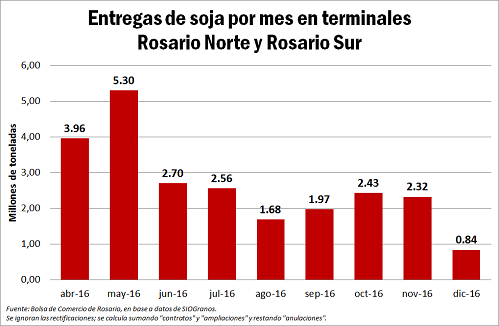 En Argentina, en tanto, la comercialización de soja de la campaña actual asciende al 74% de la producción estimada, por debajo también del 78% que se registraba para la misma altura del año anterior. Para la nueva cosecha, sin embargo, la comercialización alcanza el 7% de la producción estimada, por encima del 4% que se contaba a esta altura del año anterior. Sin embargo, debe recordarse que entre la primera vuelta de las elecciones presidenciales de octubre y el balotaje en diciembre de 2015 se habían virtualmente detenido las ventas de granos a la espera de posibles cambios en las reglas de juego, lo cual impacta en la comparación. El promedio de los últimos cinco años para el mismo guarismo alcanza el 7%.