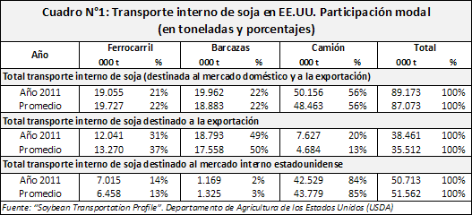 De acuerdo con el estudio, el último dato disponible corresponde al año 2011, en el que se transportaron un total de 89.174 miles de toneladas de soja, de las cuales 50.713 miles de toneladas (56,9%) fueron con destino final al mercado interno y 38.461 miles de toneladas (43,1%) con destino final a la exportación. Del total de soja transportada, el 21,4% fue por ferrocarril, el 22,4% en barcaza y el 56,2% en camión según consta en el cuadro N°1.