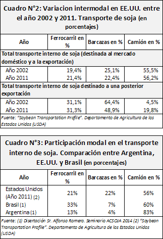 Comparemos finalmente la participación modal estimada de los tres principales países productores de soja: Estados Unidos, Brasil y Argentina. Ante la falta de datos estadísticos en Argentina referidos al transporte interno de poroto de soja, para efectuar las comparaciones utilizaremos las estimaciones realizadas por el experto Alfonso Romero en su disertación en el último Seminario de ACSOJA celebrado en octubre del año 2014 en la ciudad de Buenos Aires.